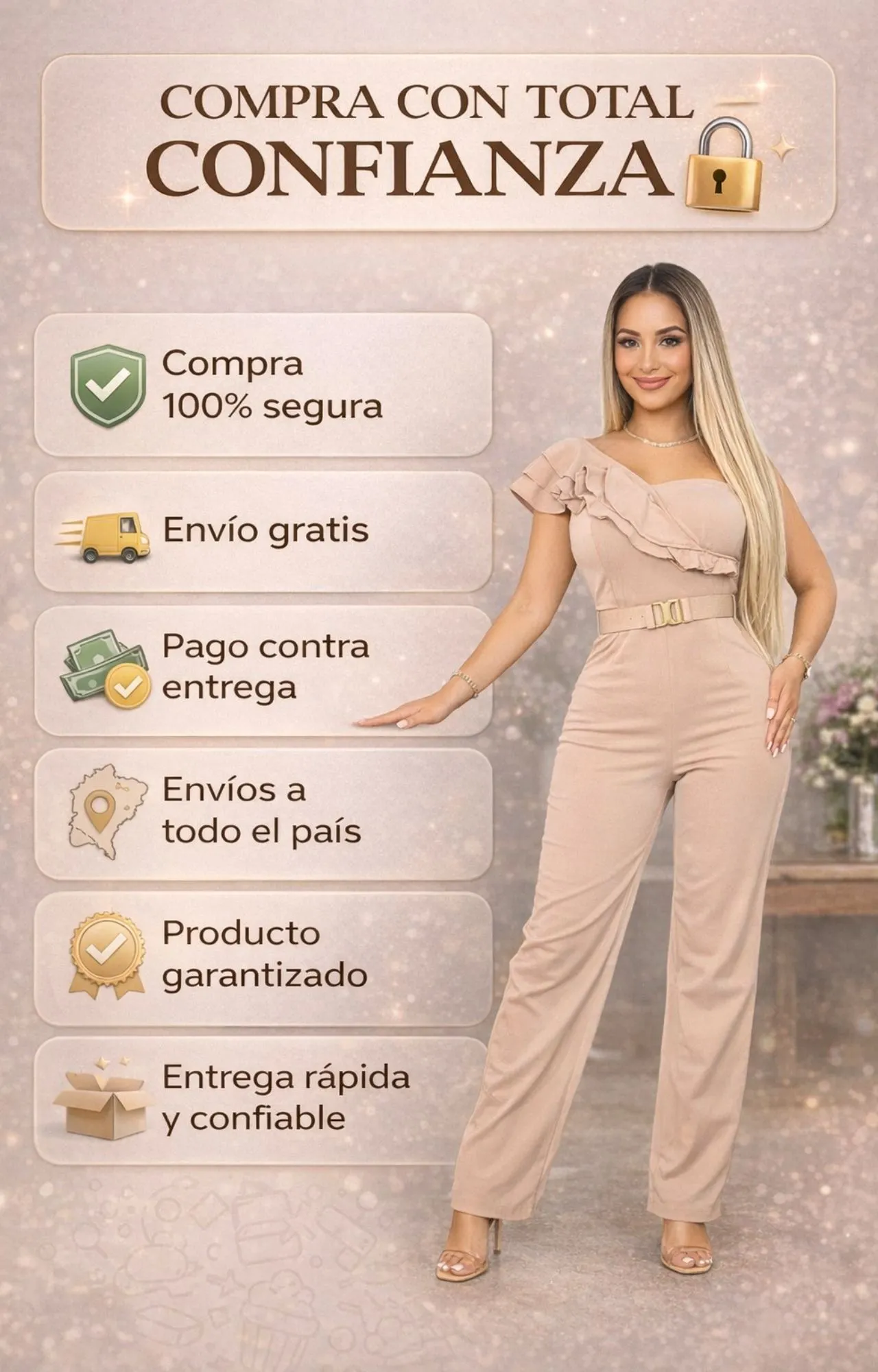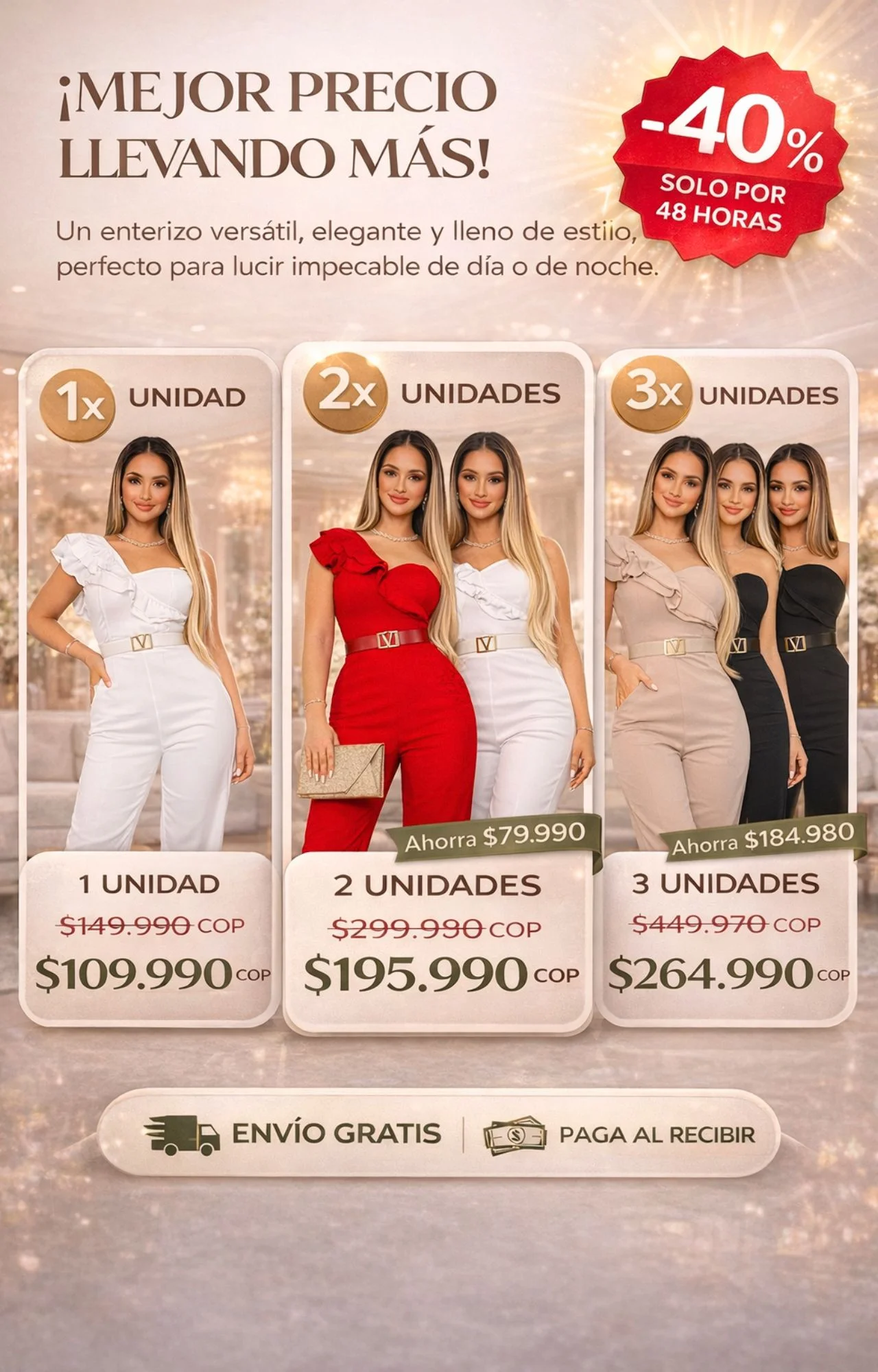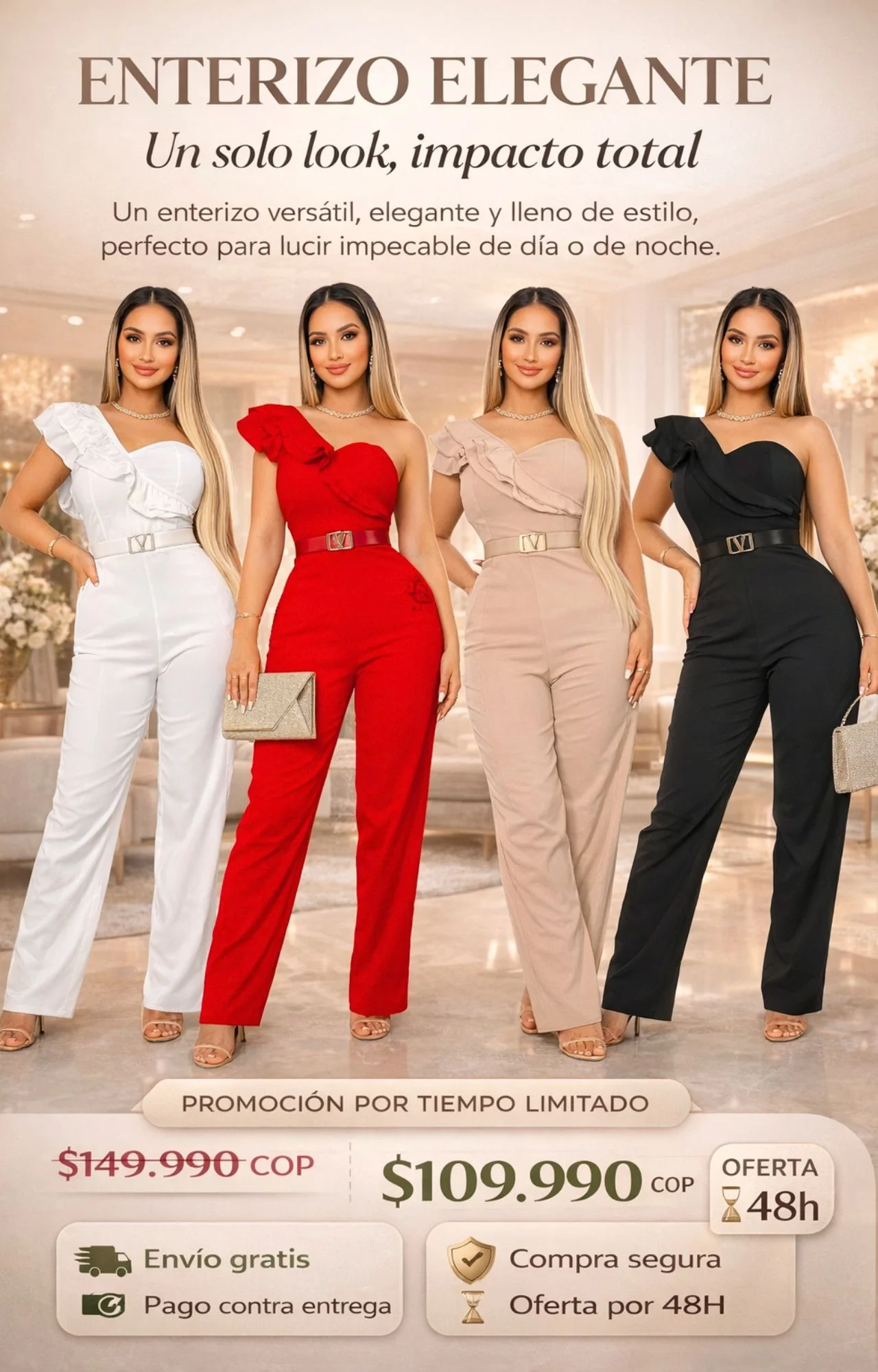 Este enterizo se encuentra disponible en 4 colores diferentes, Es ideal para eventos, cenas, reuniones especiales o salidas elegantes, ya que combina comodidad y estilo en una sola prenda.